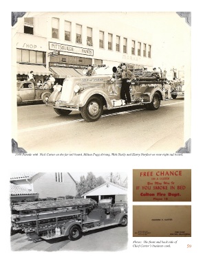 1940 Parade with Nick Carter on the far tail board, Milton Fogg driving, Walt Skelly and Harry Norfleet on rear-right tail board. Above; The front and back side of Chief Carter’s business card. 59